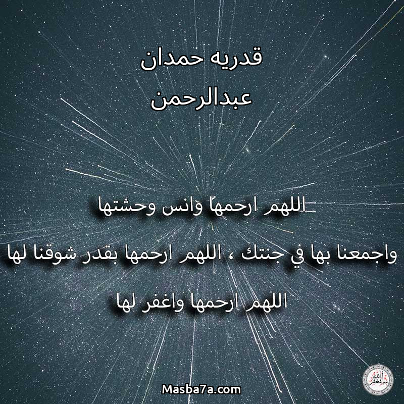 اللهم ارحم ( قدريه حمدان عبدالرحمن ) وانس وحشتها واجمعنا بها في جنتك ، اللهم ارحمها بقدر شوقنا لها اللهم ارحمها واغفر لها .