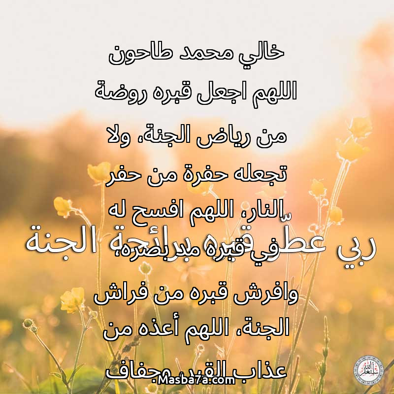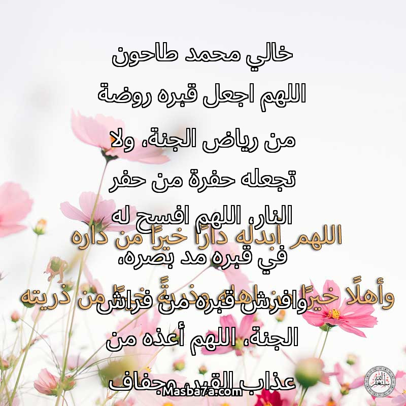 اللهم ارحم ( خالي محمد طاحون اللهم اجعل قبره روضة من رياض الجنة، ولا تجعله حفرة من حفر النار، اللهم افسح له في قبره مد بصره، وافرش قبره من فراش الجنة، اللهم أعذه من عذاب القبر، وجفاف الأرض على جنبيه، واملأ قبره بالرضا والنور، والفسحة والسرور. ) وانس وحشته واجمعنا به في جنتك ، اللهم ارحمه بقدر شوقنا له اللهم ارحمه واغفر له .