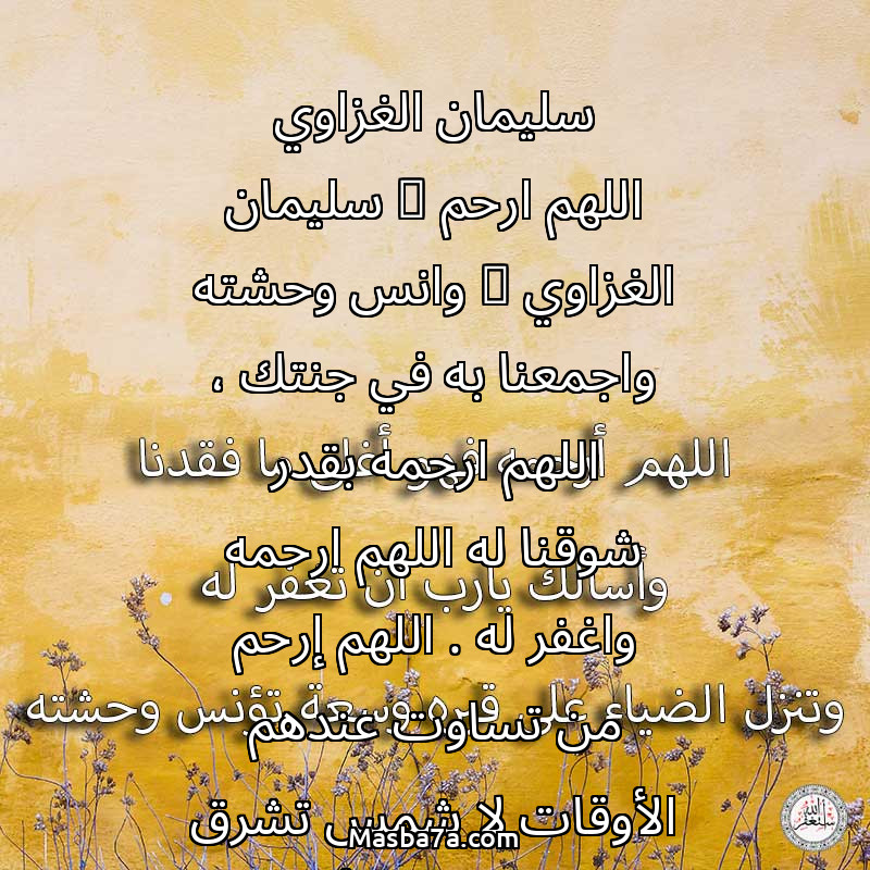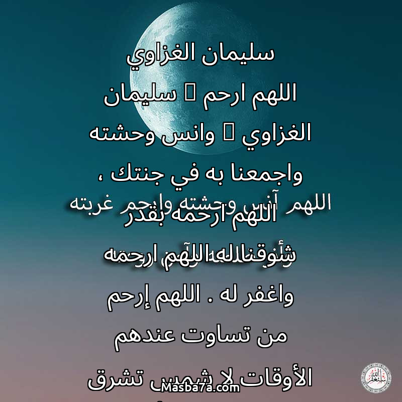 دعاء عن روح المرحوم سليمان الغزاوي اللهم ارحم ( سليمان الغزاوي ) وانس وحشته واجمعنا به في جنتك ، اللهم ارحمه بقدر شوقنا له اللهم ارحمه واغفر له . اللهم إرحم من تساوت عندهم الأوقات لا شمس تشرق عليهم ولا قمر يُضيء عتمتهم اللهم أنر قبورهم واسقهم بفيض من جنتك .