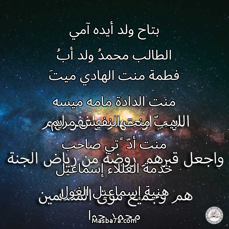 دعاء عن أرواح المرحومين بتاح ولد أيده آمي الطالب محمدُ ولد أبُ فطمة منت الهادي ميتَ منت الدادة مامه ميسه بيبّ منت النفيس مريم منت أدّ پتي صاحب خدمة العللاء إسماعيل هنية إسماعيل الغول محمد حوا