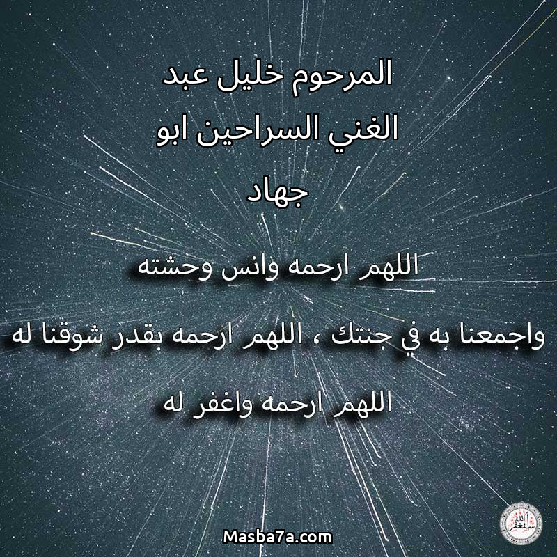 اللهم ارحم ( المرحوم خليل عبد الغني السراحين ابو جهاد ) وانس وحشته واجمعنا به في جنتك ، اللهم ارحمه بقدر شوقنا له اللهم ارحمه واغفر له .