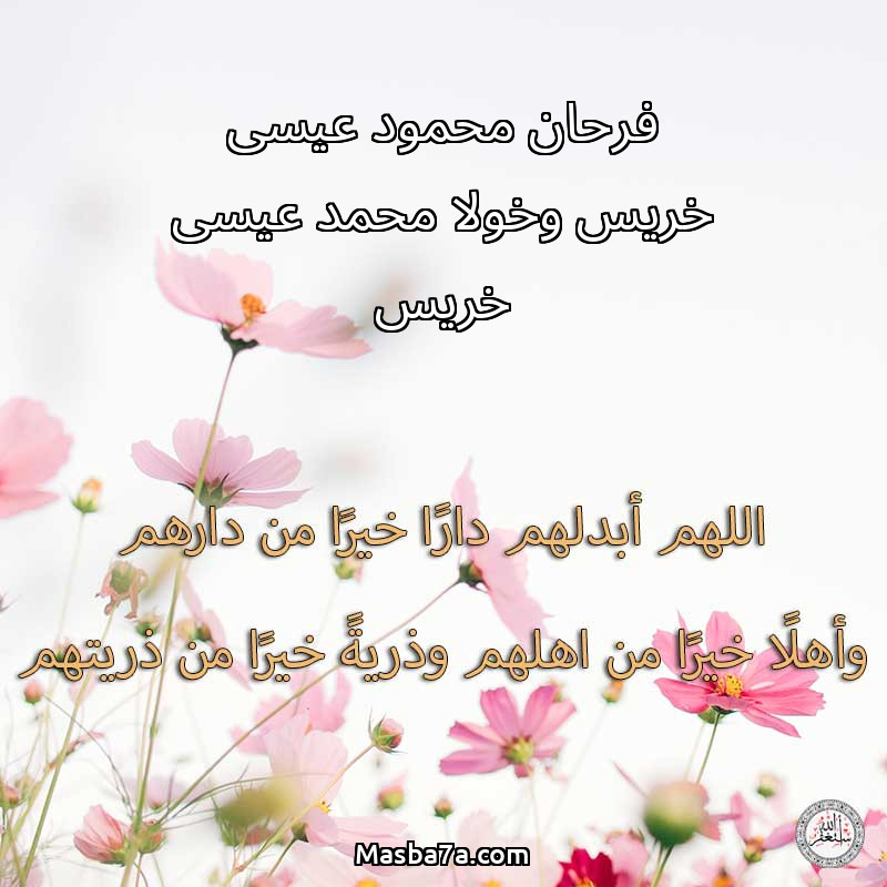 اللهم ارحم ( فرحان محمود عيسى خريس وخولا محمد عيسى خريس ) وانس وحشتهم واجمعنا بهم في جنتك ، اللهم ارحمهم بقدر شوقنا لهم اللهم ارحمهم واغفر لهم.
