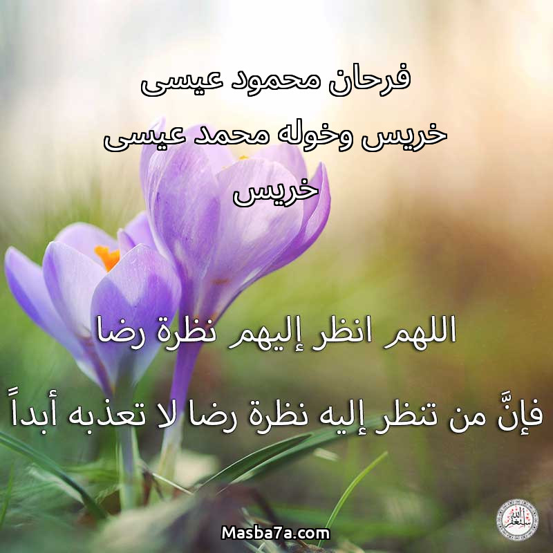 اللهم ارحم ( فرحان محمود عيسى خريس وخوله محمد عيسى خريس ) وانس وحشتهم واجمعنا بهم في جنتك ، اللهم ارحمهم بقدر شوقنا لهم اللهم ارحمهم واغفر لهم.