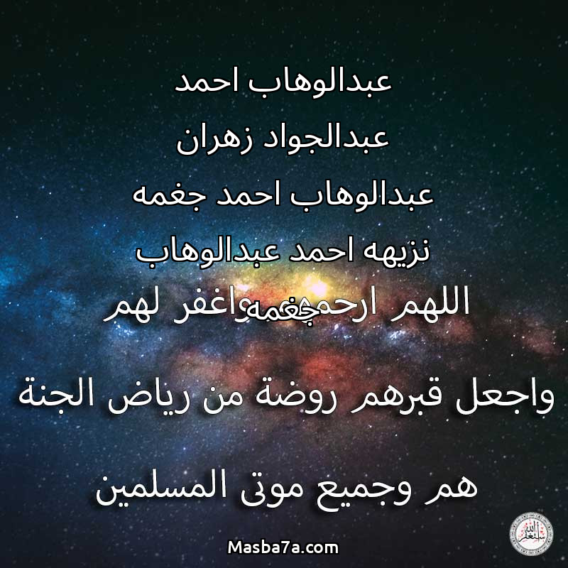 اللهم ارحم ( عبدالوهاب احمد عبدالجواد زهران عبدالوهاب احمد جغمه نزيهه احمد عبدالوهاب جغمه ) وانس وحشتهم واجمعنا بهم في جنتك ، اللهم ارحمهم بقدر شوقنا لهم اللهم ارحمهم واغفر لهم.