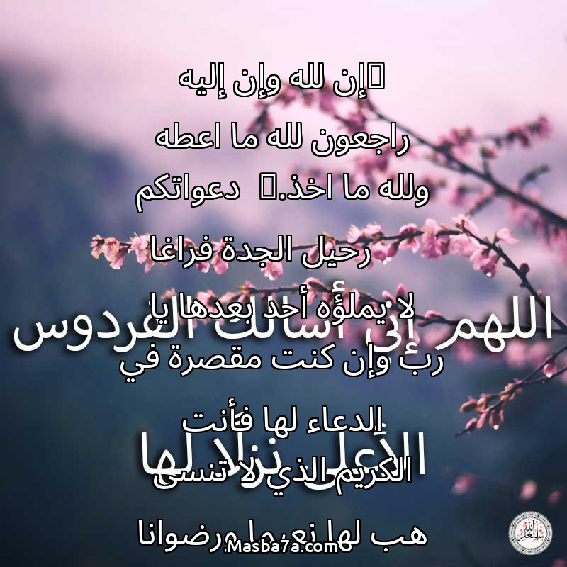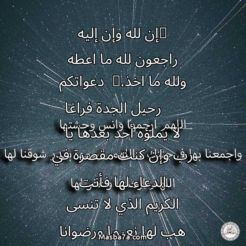 دعاء عن روح المرحومة (إن لله وإن إليه راجعون لله ما اعطه ولله ما اخذ.) دعواتكم رحيل الجدة فراغا لا يملؤه أحد بعدها يا رب وإن كنت مقصرة في الدعاء لها فأنت الكريم الذي لا تنسى هب لها نعيما ورضوانا وسرورا.