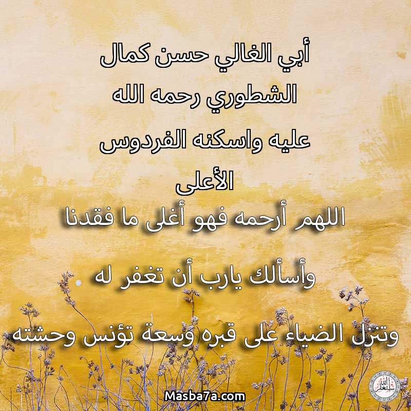 اللهم ارحم ( أبي الغالي حسن كمال الشطوري رحمه الله عليه واسكنه الفردوس الأعلى ) وانس وحشته واجمعنا به في جنتك ، اللهم ارحمه بقدر شوقنا له اللهم ارحمه واغفر له .