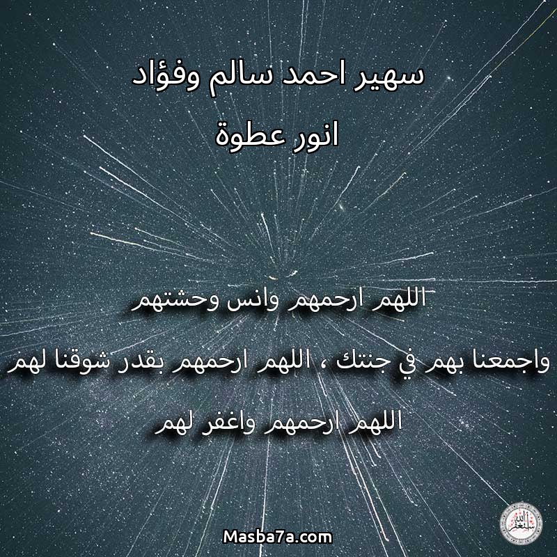 اللهم ارحم ( سهير احمد سالم وفؤاد انور عطوة ) وانس وحشتهم واجمعنا بهم في جنتك ، اللهم ارحمهم بقدر شوقنا لهم اللهم ارحمهم واغفر لهم.