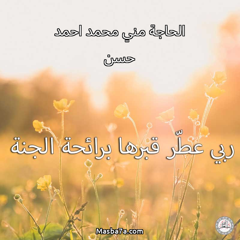 اللهم ارحم ( الحاجة مني محمد احمد حسن ) وانس وحشتها واجمعنا بها في جنتك ، اللهم ارحمها بقدر شوقنا لها اللهم ارحمها واغفر لها .
