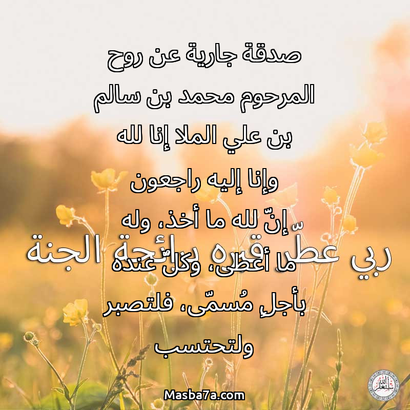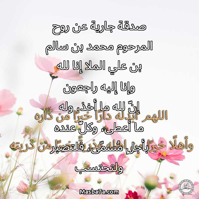 دعاء عن روح المرحوم صدقة جارية عن روح المرحوم محمد بن سالم بن علي الملا إنا لله وإنا إليه راجعون إنَّ لله ما أخذ، وله ما أعطى، وكلٌّ عنده بأجلٍ مُسمّى، فلتصبر ولتحتسب