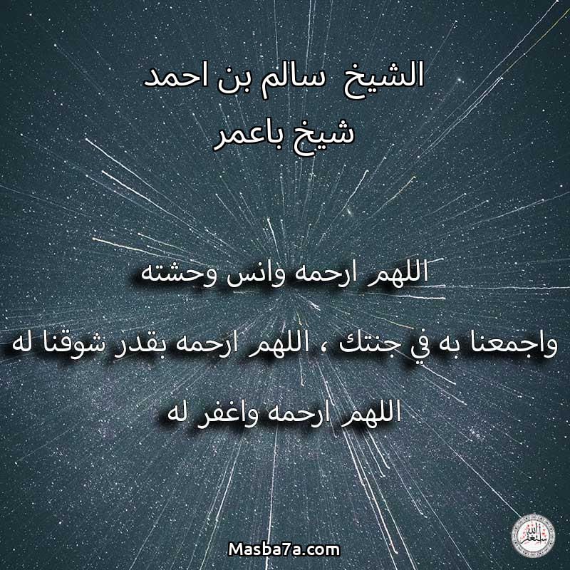 اللهم ارحم ( الشيخ سالم بن احمد شيخ باعمر ) وانس وحشته واجمعنا به في جنتك ، اللهم ارحمه بقدر شوقنا له اللهم ارحمه واغفر له .