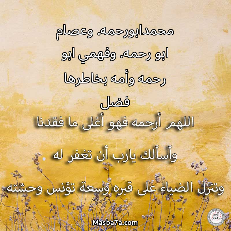 اللهم ارحم ( محمدابورحمه. وعصام ابو رحمه. وفهمي ابو رحمه وأمه بخاطرها فضل ) وانس وحشته واجمعنا به في جنتك ، اللهم ارحمه بقدر شوقنا له اللهم ارحمه واغفر له .