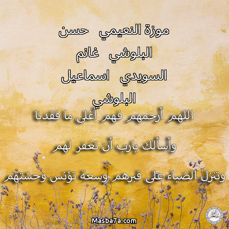 اللهم ارحم ( موزة النعيمي - حسن البلوشي - غانم السويدي - اسماعيل البلوشي ) وانس وحشتهم واجمعنا بهم في جنتك ، اللهم ارحمهم بقدر شوقنا لهم اللهم ارحمهم واغفر لهم.
