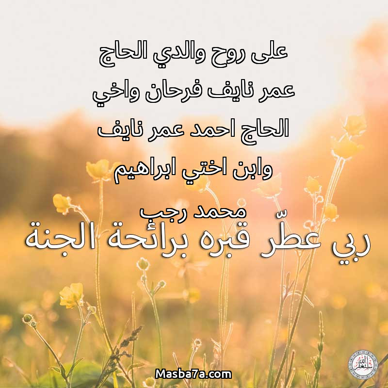 اللهم ارحم ( على روح والدي الحاج عمر نايف فرحان واخي الحاج احمد عمر نايف وابن اختي ابراهيم محمد رجب ) وانس وحشته واجمعنا به في جنتك ، اللهم ارحمه بقدر شوقنا له اللهم ارحمه واغفر له .