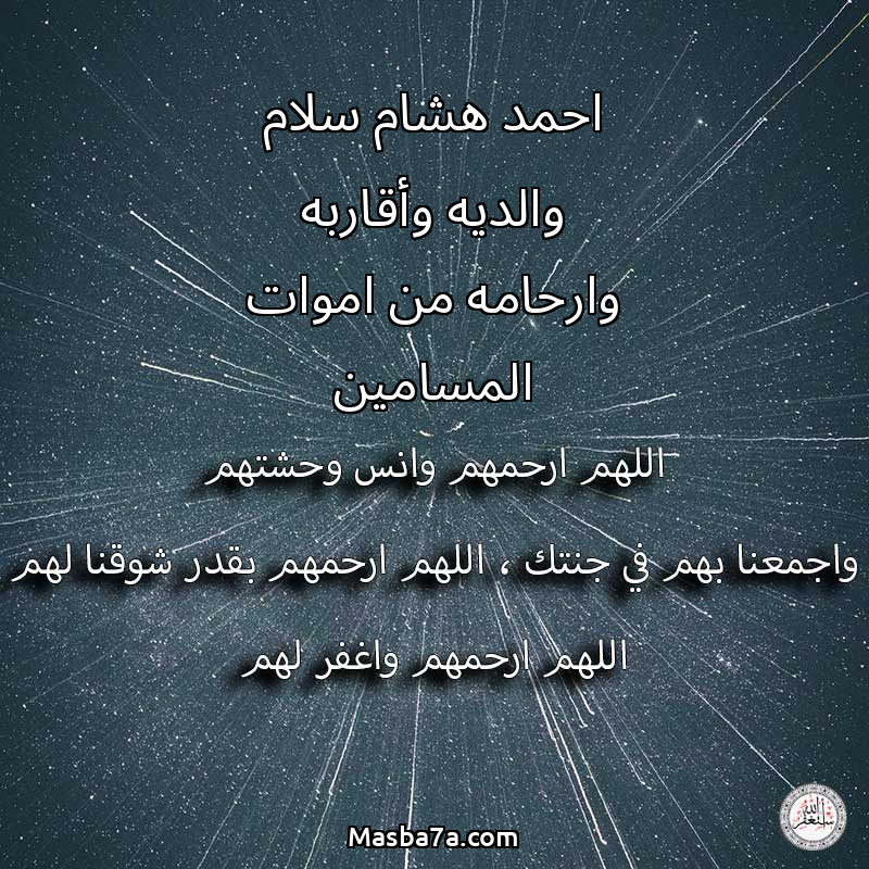 اللهم ارحم ( احمد هشام سلام والديه وأقاربه وارحامه من اموات المسامين ) وانس وحشتهم واجمعنا بهم في جنتك ، اللهم ارحمهم بقدر شوقنا لهم اللهم ارحمهم واغفر لهم.