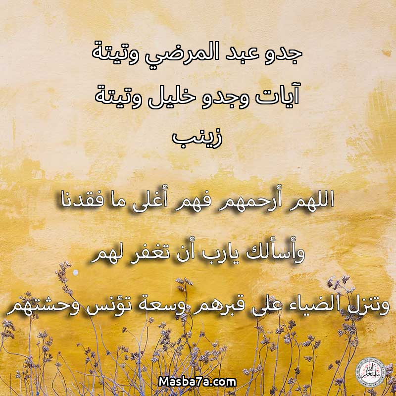 اللهم ارحم ( جدو عبد المرضي وتيتة آيات وجدو خليل وتيتة زينب ) وانس وحشتهم واجمعنا بهم في جنتك ، اللهم ارحمهم بقدر شوقنا لهم اللهم ارحمهم واغفر لهم.