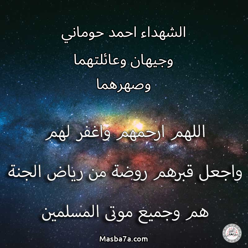 اللهم ارحم ( الشهداء احمد حوماني وجيهان وعائلتهما وصهرهما ) وانس وحشتهم واجمعنا بهم في جنتك ، اللهم ارحمهم بقدر شوقنا لهم اللهم ارحمهم واغفر لهم.