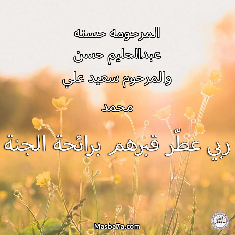 اللهم ارحم ( المرحومه حسنه عبدالحليم حسن والمرحوم سعيد علي محمد ) وانس وحشتهم واجمعنا بهم في جنتك ، اللهم ارحمهم بقدر شوقنا لهم اللهم ارحمهم واغفر لهم.