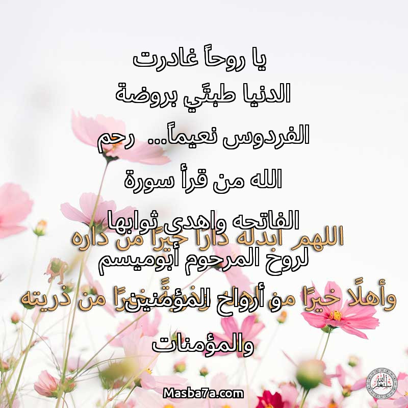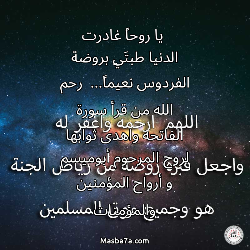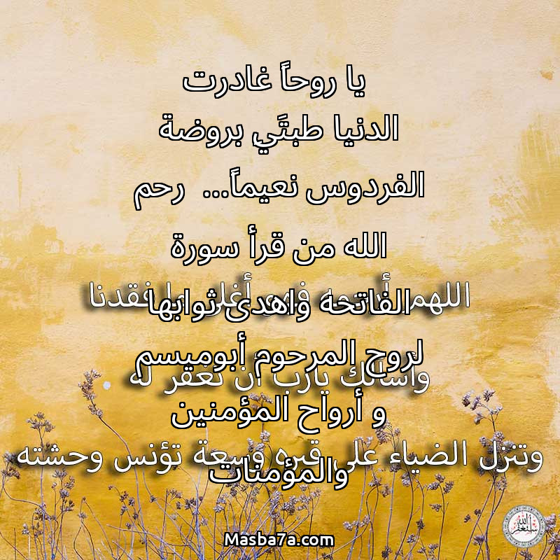 دعاء عن روح المرحوم يا روحاً غادرت الدنيا طبتَيِ بروضة الفردوس نعيماً... رحم الله من قرأ سورة الفاتحه واهدى ثوابها لروح المرحوم أبوميسم و أرواح المؤمنين والمؤمنات