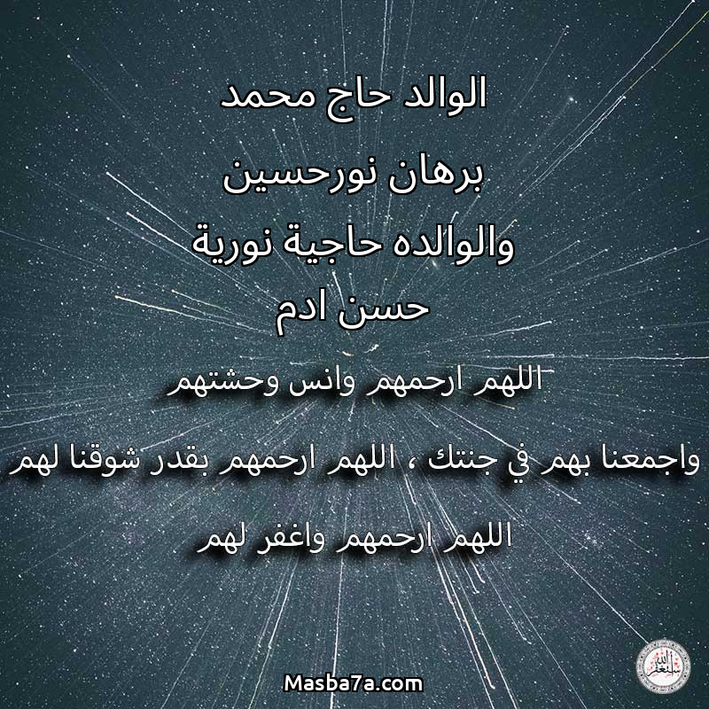 اللهم ارحم ( الوالد حاج محمد برهان نورحسين والوالده حاجية نورية حسن ادم ) وانس وحشتهم واجمعنا بهم في جنتك ، اللهم ارحمهم بقدر شوقنا لهم اللهم ارحمهم واغفر لهم.