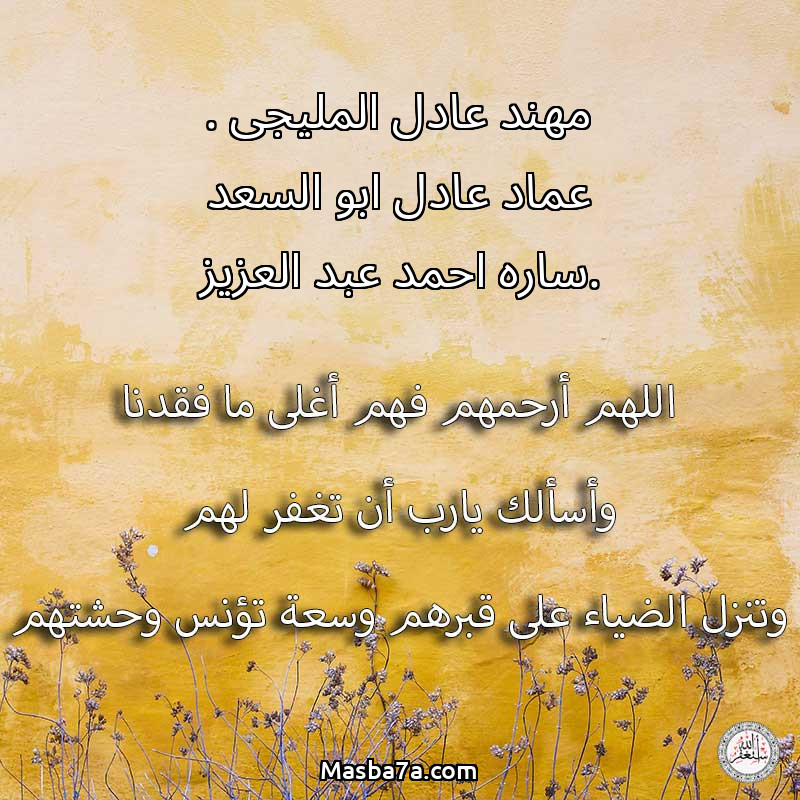 اللهم ارحم ( مهند عادل المليجى . عماد عادل ابو السعد .ساره احمد عبد العزيز ) وانس وحشتهم واجمعنا بهم في جنتك ، اللهم ارحمهم بقدر شوقنا لهم اللهم ارحمهم واغفر لهم.
