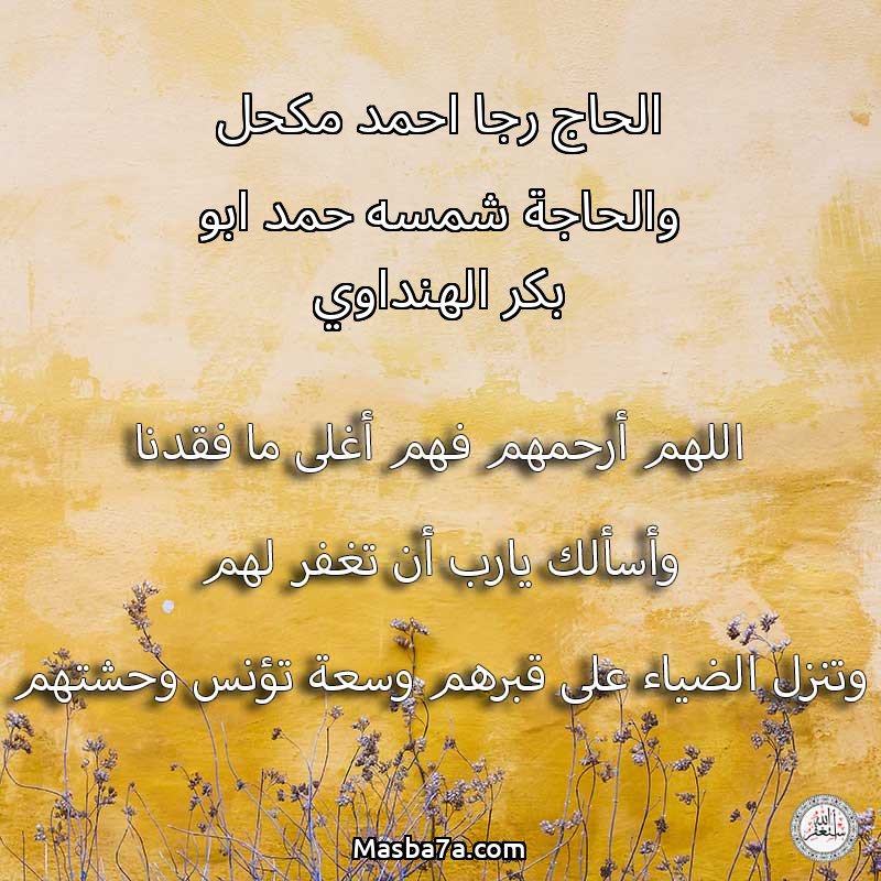 اللهم ارحم ( الحاج رجا احمد مكحل والحاجة شمسه حمد ابو بكر الهنداوي ) وانس وحشتهم واجمعنا بهم في جنتك ، اللهم ارحمهم بقدر شوقنا لهم اللهم ارحمهم واغفر لهم.