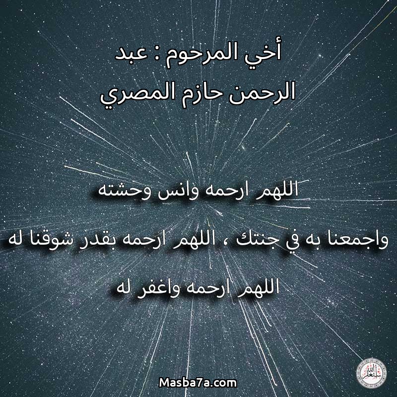 اللهم ارحم ( أخي المرحوم : عبد الرحمن حازم المصري ) وانس وحشته واجمعنا به في جنتك ، اللهم ارحمه بقدر شوقنا له اللهم ارحمه واغفر له .