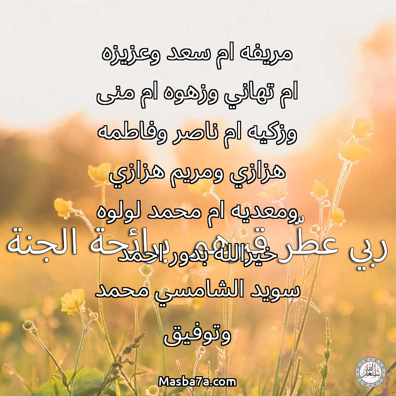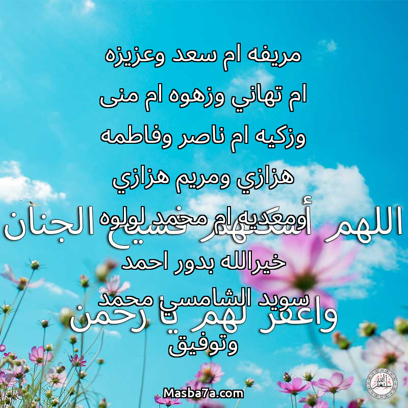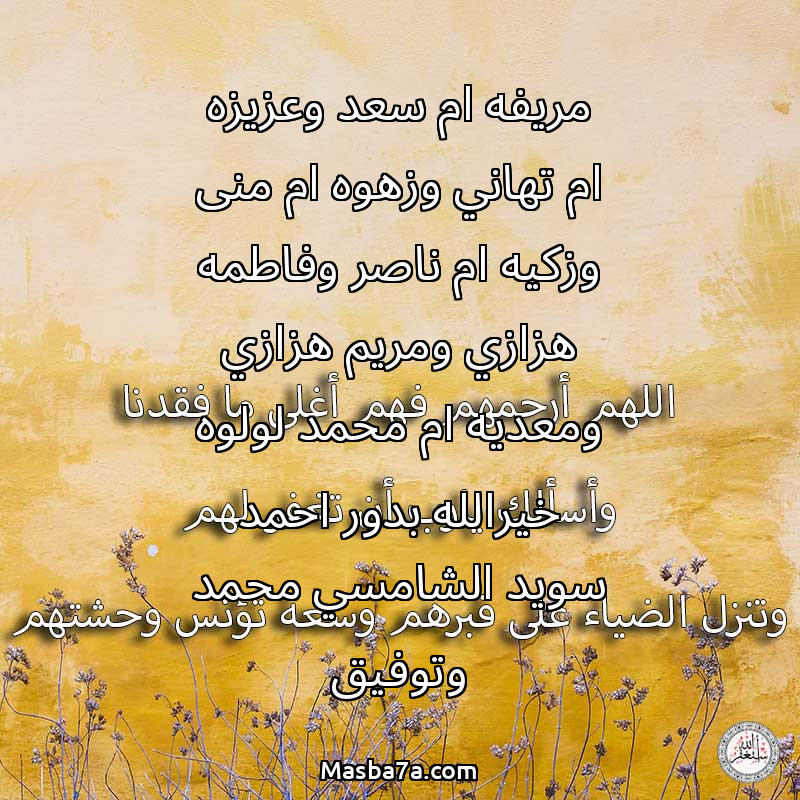 دعاء عن أرواح المرحومين مريفه ام سعد وعزيزه ام تهاني وزهوه ام منى وزكيه ام ناصر وفاطمه هزازي ومريم هزازي ومعديه ام محمد لولوه خيرالله بدور احمد سويد الشامسي محمد وتوفيق