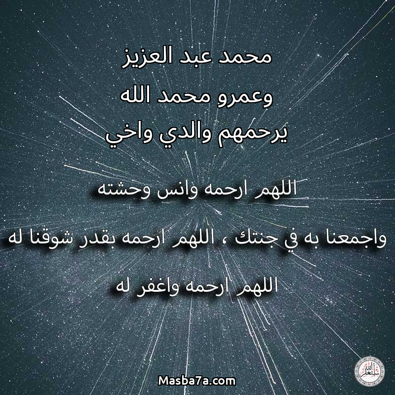 اللهم ارحم ( محمد عبد العزيز وعمرو محمد الله يرحمهم والدي واخي ) وانس وحشته واجمعنا به في جنتك ، اللهم ارحمه بقدر شوقنا له اللهم ارحمه واغفر له .
