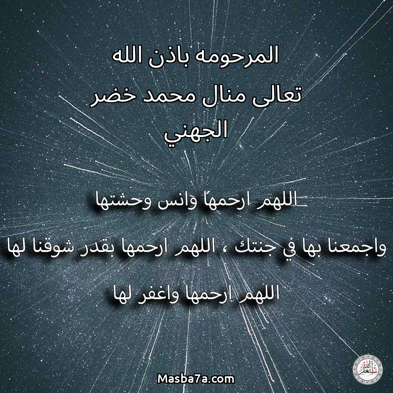 اللهم ارحم ( المرحومه باذن الله تعالى منال محمد خضر الجهني ) وانس وحشتها واجمعنا بها في جنتك ، اللهم ارحمها بقدر شوقنا لها اللهم ارحمها واغفر لها .
