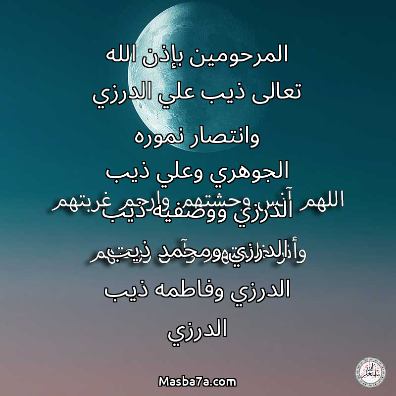اللهم ارحم ( المرحومين بإذن الله تعالى ذيب علي الدرزي وانتصار نموره الجوهري وعلي ذيب الدرزي ووصفيه ذيب الدرزي ومحمد ذيب الدرزي وفاطمه ذيب الدرزي ) وانس وحشتهم واجمعنا بهم في جنتك ، اللهم ارحمهم بقدر شوقنا لهم اللهم ارحمهم واغفر لهم.