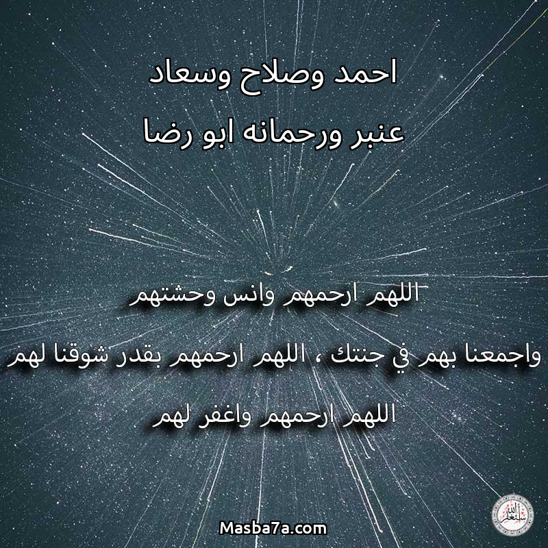 اللهم ارحم ( احمد وصلاح وسعاد عنبر ورحمانه ابو رضا ) وانس وحشتهم واجمعنا بهم في جنتك ، اللهم ارحمهم بقدر شوقنا لهم اللهم ارحمهم واغفر لهم.