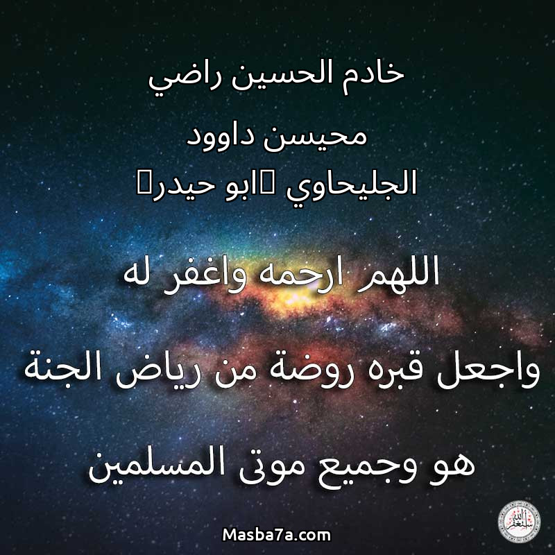 اللهم ارحم ( خادم الحسين راضي محيسن داوود الجليحاوي (ابو حيدر) ) وانس وحشته واجمعنا به في جنتك ، اللهم ارحمه بقدر شوقنا له اللهم ارحمه واغفر له .