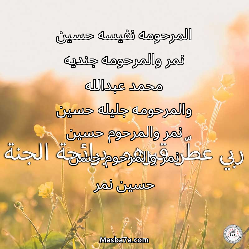 اللهم ارحم ( المرحومه نفيسه حسين نمر والمرحومه جنديه محمد عبدالله والمرحومه جليله حسين نمر والمرحوم حسين نمر والمرحوم حسن حسين نمر ) وانس وحشتهم واجمعنا بهم في جنتك ، اللهم ارحمهم بقدر شوقنا لهم اللهم ارحمهم واغفر لهم.