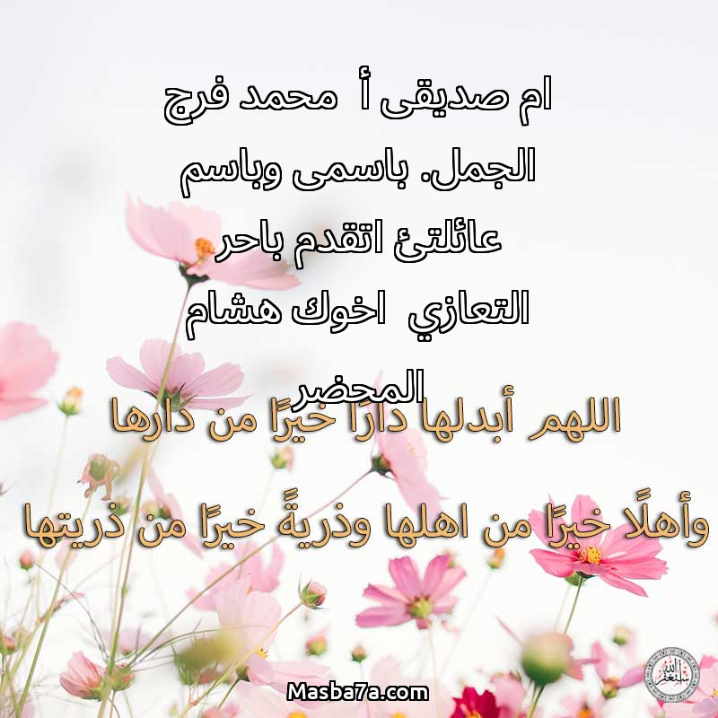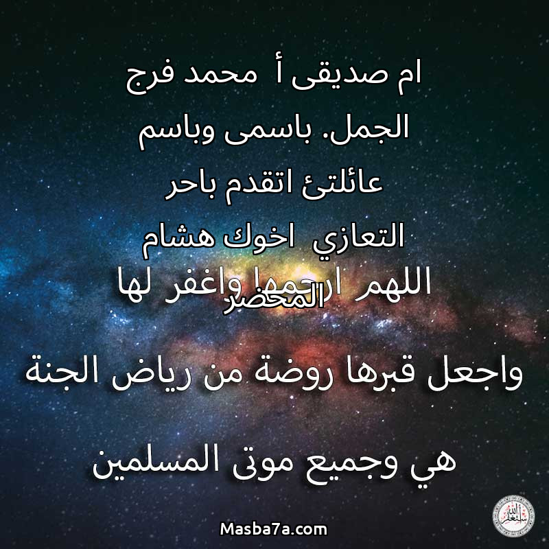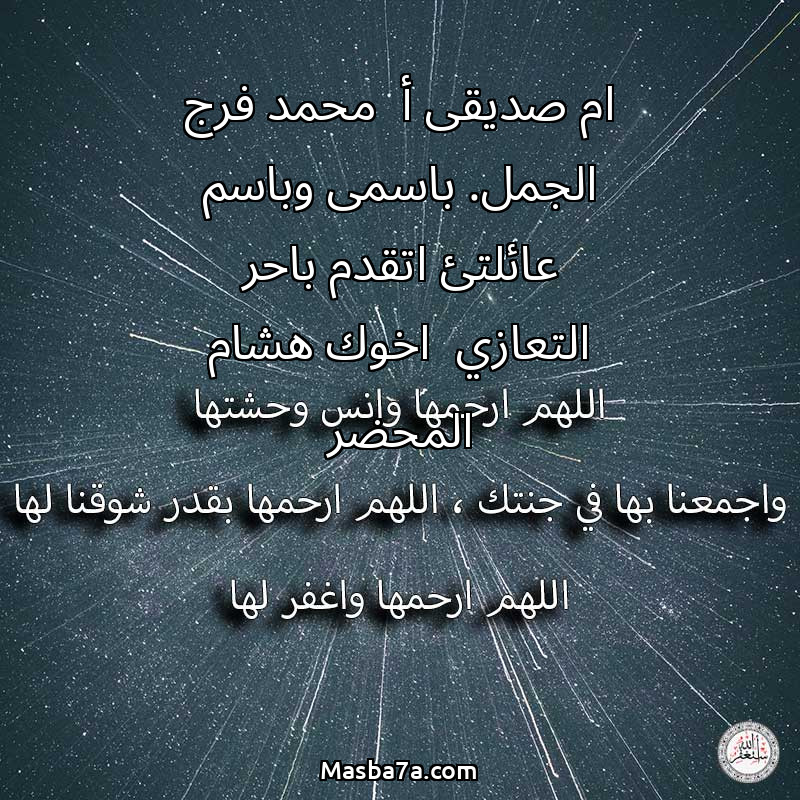 اللهم ارحم ( ام صديقى أ محمد فرج الجمل. باسمى وباسم عائلتئ اتقدم باحر التعازي اخوك هشام المحضر ) وانس وحشتها واجمعنا بها في جنتك ، اللهم ارحمها بقدر شوقنا لها اللهم ارحمها واغفر لها .