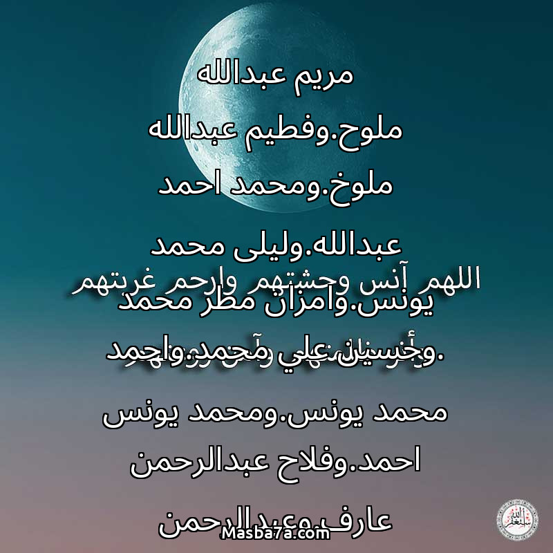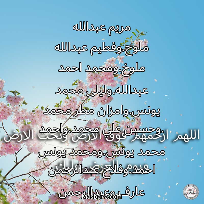 اللهم ارحم ( مريم عبدالله ملوح.وفطيم عبدالله ملوخ.ومحمد احمد عبدالله.وليلى محمد يونس.وامزان مطر محمد .وحسين علي محمد.واحمد محمد يونس.ومحمد يونس احمد.وفلاح عبدالرحمن عارف.وعبدالرحمن عارف.وعلي عدنان عيسى .وعزيز علي حسن.وحسين علي حسن.ونمشه حسين صالح.وعبيدة عامر خضير.وترفة عبدالله كرم. ) وانس وحشتهم واجمعنا بهم في جنتك ، اللهم ارحمهم بقدر شوقنا لهم اللهم ارحمهم واغفر لهم.