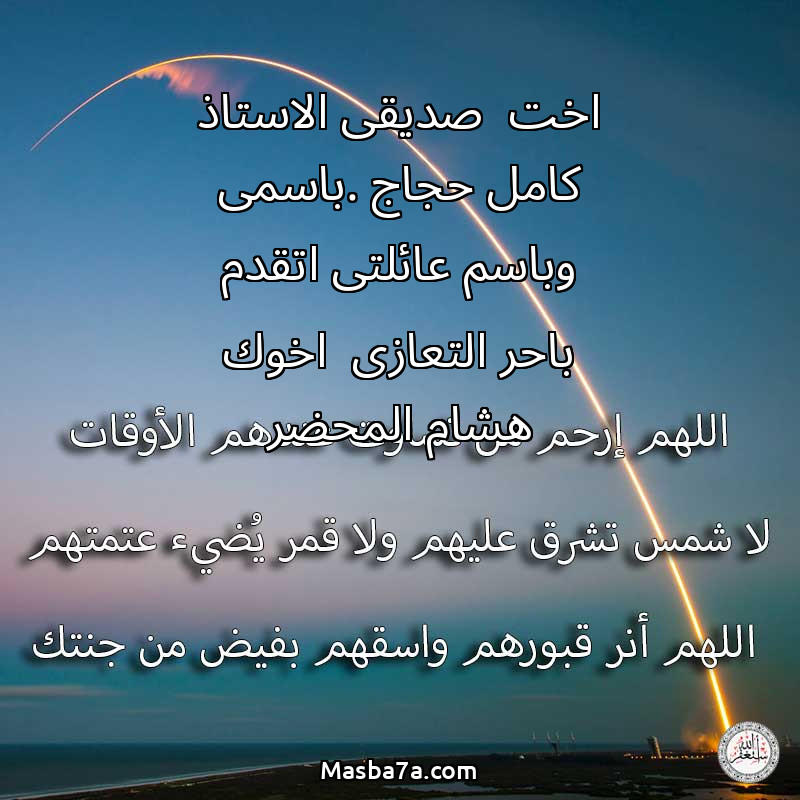 اللهم ارحم ( اخت صديقى الاستاذ كامل حجاج .باسمى وباسم عائلتى اتقدم باحر التعازى اخوك هشام المحضر ) وانس وحشتها واجمعنا بها في جنتك ، اللهم ارحمها بقدر شوقنا لها اللهم ارحمها واغفر لها .