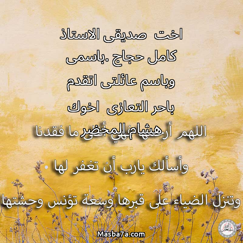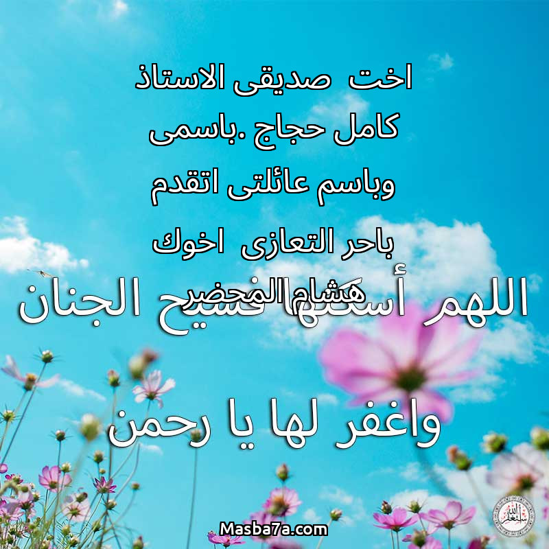 دعاء عن روح المرحومة اخت صديقى الاستاذ كامل حجاج .باسمى وباسم عائلتى اتقدم باحر التعازى اخوك هشام المحضر