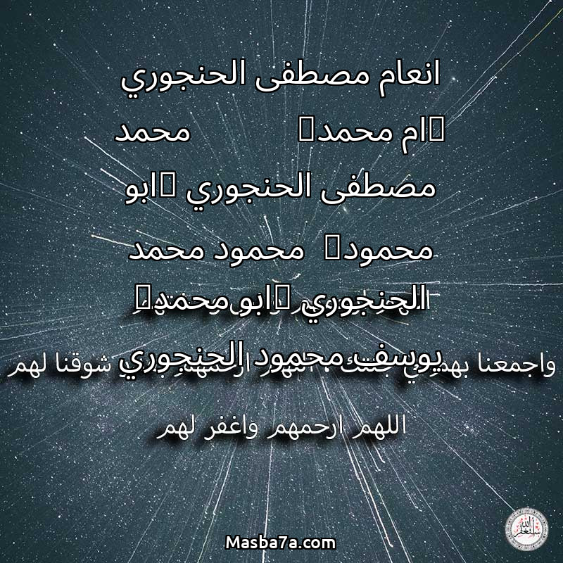 اللهم ارحم ( انعام مصطفى الحنجوري (ام محمد) محمد مصطفى الحنجوري (ابو محمود) محمود محمد الحنجوري (ابو محمد) يوسف محمود الحنجوري ) وانس وحشتهم واجمعنا بهم في جنتك ، اللهم ارحمهم بقدر شوقنا لهم اللهم ارحمهم واغفر لهم.