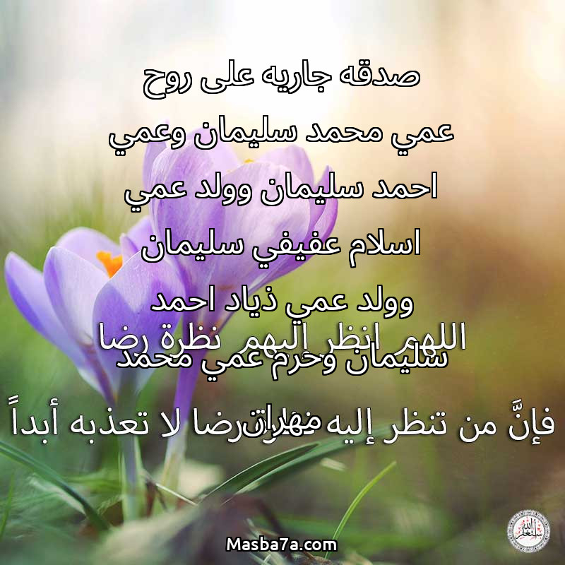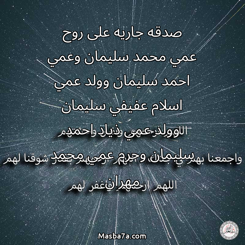 دعاء عن أرواح المرحومين صدقه جاريه على روح عمي محمد سليمان وعمي احمد سليمان وولد عمي اسلام عفيفي سليمان وولد عمي ذياد احمد سليمان وحرم عمي محمد مهران