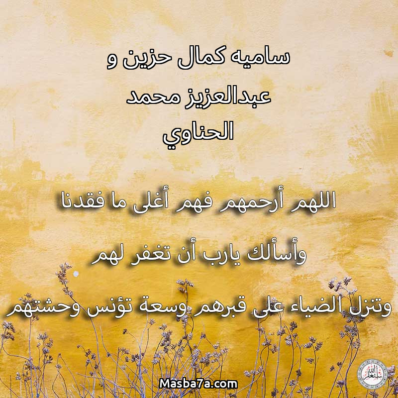 اللهم ارحم ( ساميه كمال حزين و عبدالعزيز محمد الحناوي ) وانس وحشتهم واجمعنا بهم في جنتك ، اللهم ارحمهم بقدر شوقنا لهم اللهم ارحمهم واغفر لهم.