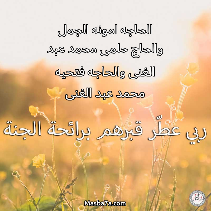 اللهم ارحم ( الحاجه امونه الجمل والحاج حلمى محمد عبد الغنى والحاجه فتحيه محمد عبد الغنى ) وانس وحشتهم واجمعنا بهم في جنتك ، اللهم ارحمهم بقدر شوقنا لهم اللهم ارحمهم واغفر لهم.
