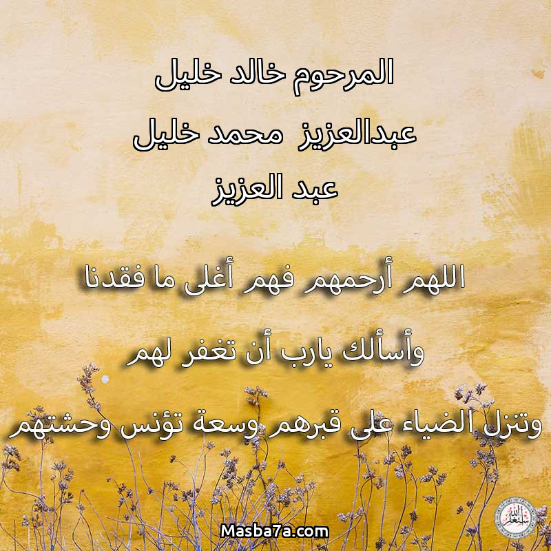اللهم ارحم ( المرحوم خالد خليل عبدالعزيز -محمد خليل عبد العزيز ) وانس وحشتهم واجمعنا بهم في جنتك ، اللهم ارحمهم بقدر شوقنا لهم اللهم ارحمهم واغفر لهم.