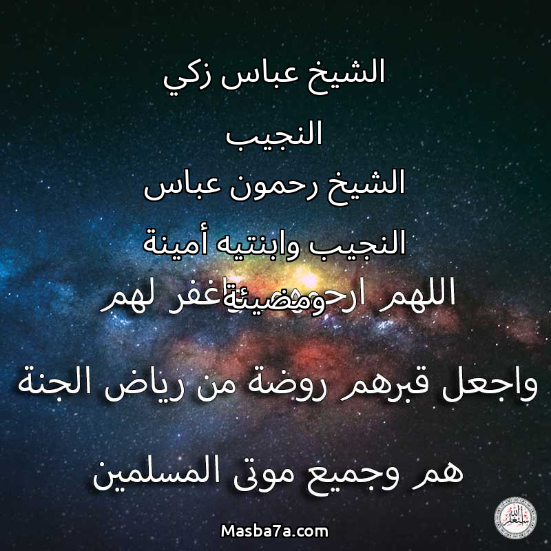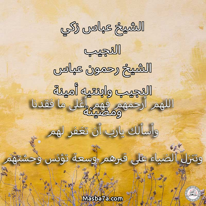 اللهم ارحم ( الشيخ عباس زكي النجيب الشيخ رحمون عباس النجيب وابنتيه أمينة ومضيئة ) وانس وحشتهم واجمعنا بهم في جنتك ، اللهم ارحمهم بقدر شوقنا لهم اللهم ارحمهم واغفر لهم.