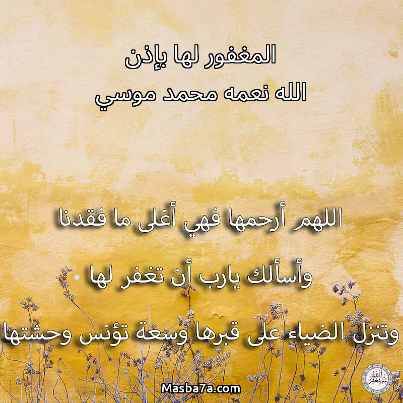 اللهم ارحم ( المغفور لها بإذن الله نعمه محمد موسي ) وانس وحشتها واجمعنا بها في جنتك ، اللهم ارحمها بقدر شوقنا لها اللهم ارحمها واغفر لها .