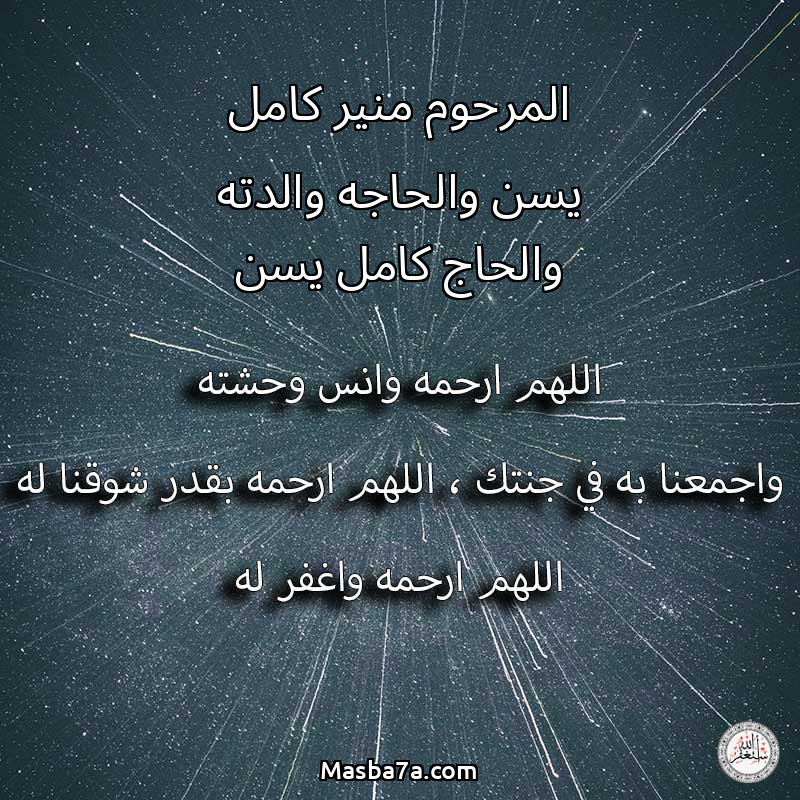اللهم ارحم ( المرحوم منير كامل يسن والحاجه والدته والحاج كامل يسن ) وانس وحشته واجمعنا به في جنتك ، اللهم ارحمه بقدر شوقنا له اللهم ارحمه واغفر له .