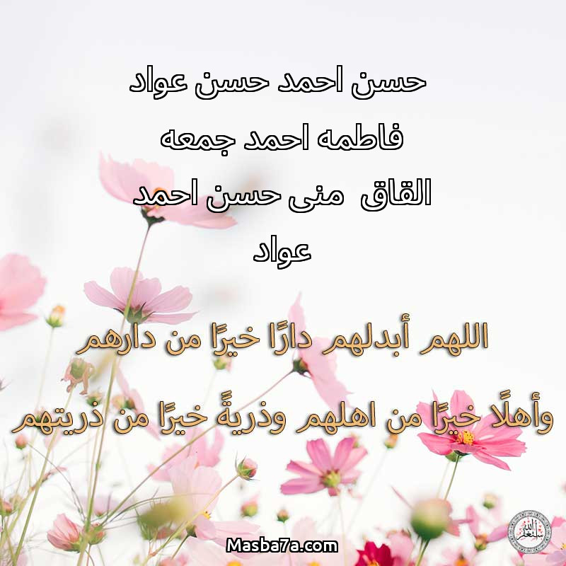 اللهم ارحم ( حسن احمد حسن عواد فاطمه احمد جمعه القاق منى حسن احمد عواد ) وانس وحشتهم واجمعنا بهم في جنتك ، اللهم ارحمهم بقدر شوقنا لهم اللهم ارحمهم واغفر لهم.