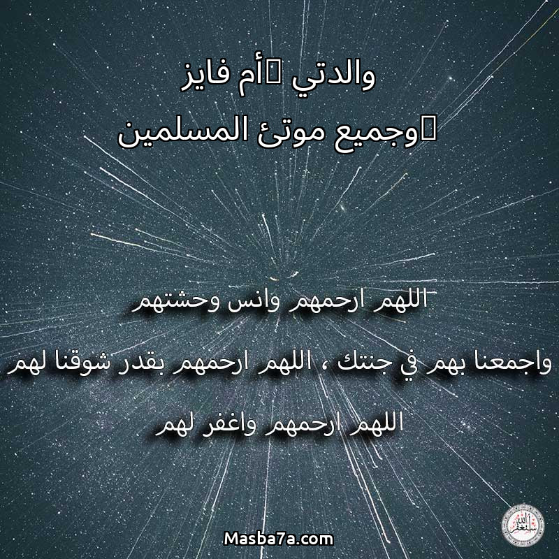 اللهم ارحم ( والدتي (أم فايز )وجميع موتئ المسلمين ) وانس وحشتهم واجمعنا بهم في جنتك ، اللهم ارحمهم بقدر شوقنا لهم اللهم ارحمهم واغفر لهم.