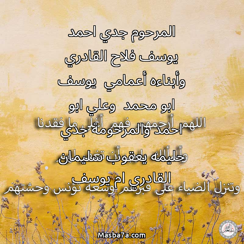 دعاء عن أرواح المرحومين المرحوم جدي احمد يوسف فلاح القادري وأبناءه أعمامي يوسف ابو محمد وعلي ابو احمد والمرحومة جدي حليمه يعقوب سليمان القادري ام يوسف
