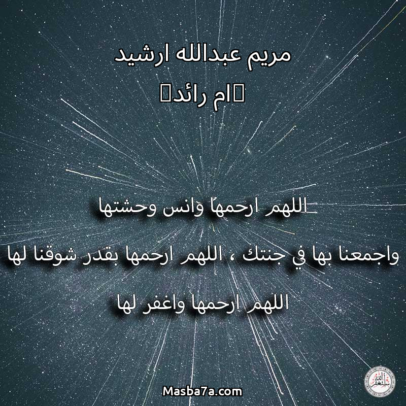 اللهم ارحم ( مريم عبدالله ارشيد (ام رائد) ) وانس وحشتها واجمعنا بها في جنتك ، اللهم ارحمها بقدر شوقنا لها اللهم ارحمها واغفر لها .
