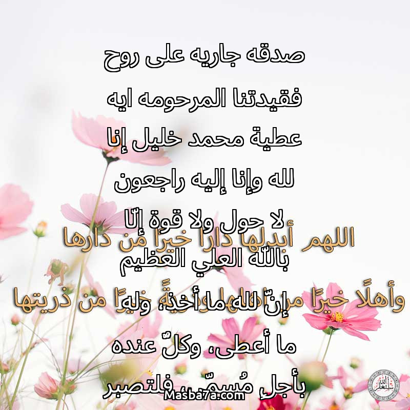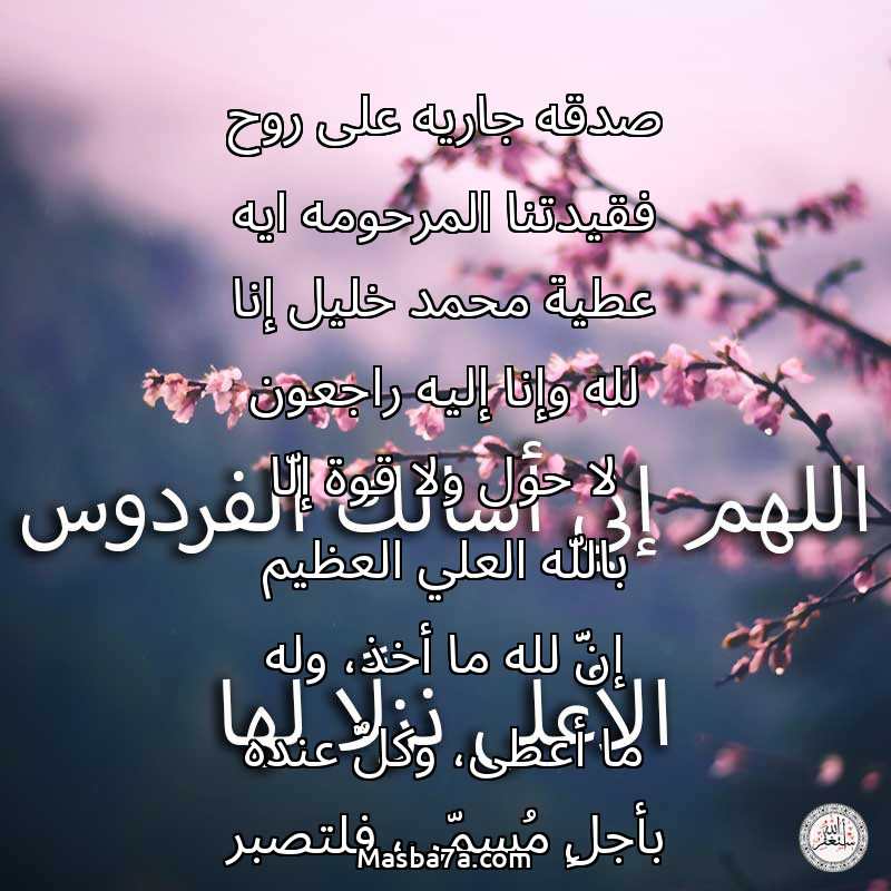 دعاء عن روح المرحومة صدقه جاريه على روح فقيدتنا المرحومه ايه عطية محمد خليل إنا لله وإنا إليه راجعون لا حول ولا قوة إلّا باللّه العلي العظيم إنَّ لله ما أخذ، وله ما أعطى، وكلٌّ عنده بأجلٍ مُسمّى، فلتصبر ولتحتسب